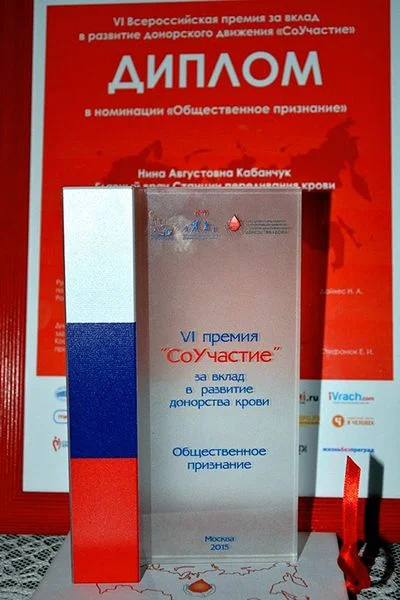Из 32 претендентов в номинации «Общественное признание» жюри были отобраны девять лауреатов, среди которых - заместитель Министра здравоохранения Российской Федерации Татьяна Яковлева, заместитель начальника Управления здравоохранения Федерального медико-биологического агентства Ольга Эйхлер, руководитель аппарата Общественной палаты РФ Сергей Смирнов. В число победителей в этой номинации вошла и главный врач Областной станции переливания крови (СПККО), заслуженный врач РФ, кавалер орденов Почета и «За заслуги перед Калининградской областью», почетный гражданин города Калининграда, врач высшей категории Нина Кабанчук.